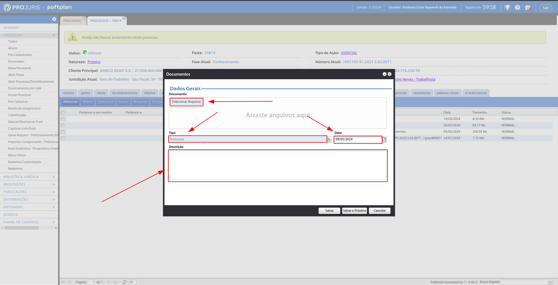 Ação: Nesta etapa, devemos clicar em "Selecionar Arquivos" para fazer upload dos arquivos necessários e validar os campos: "Tipo", "Data" e "Descrição". |