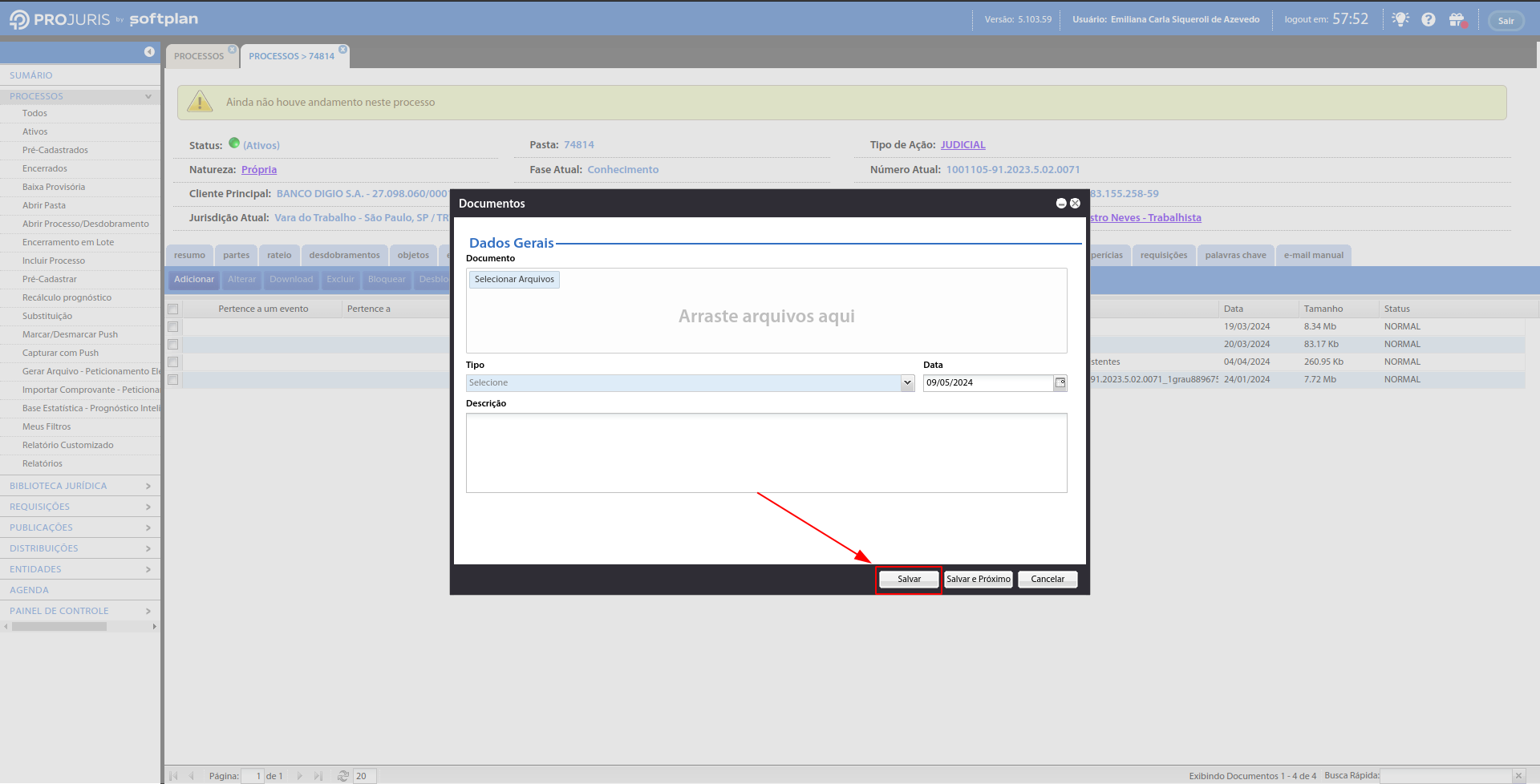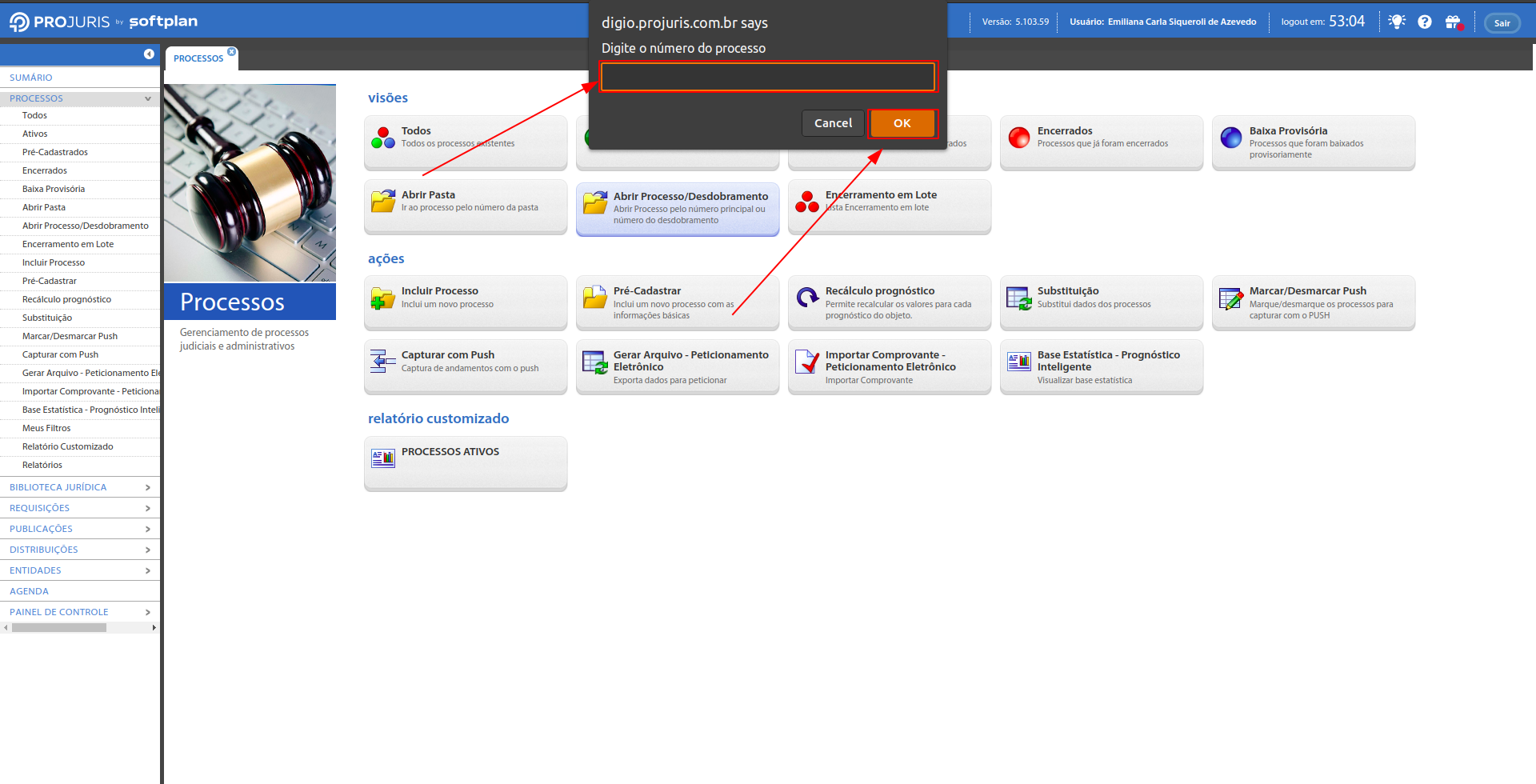 Ação: Feito isso, aparecerá um pop-up onde devemos preencher com o "número do processo" e clicar em "ok". |