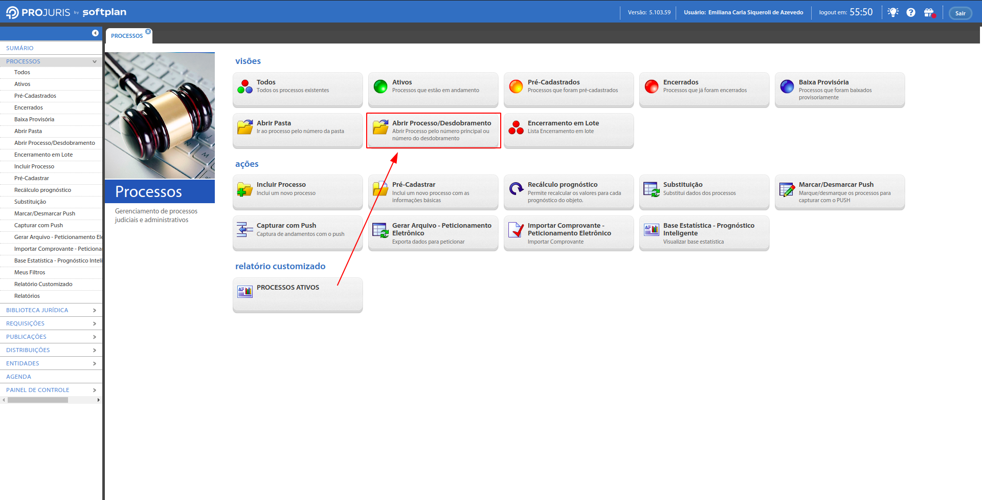 Ação: Para realizar a pesquisa, selecione a opção "Abrir Processo/Desdobramento".