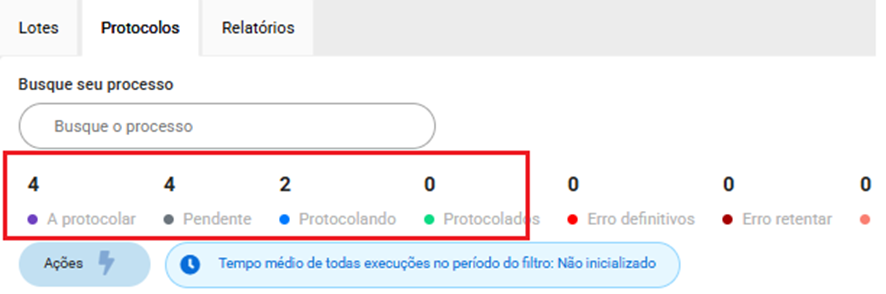Assim que finalizar o carregamento, todos os itens aparecerão no status “a protocolar” – selecione todos e clique em “ações”: