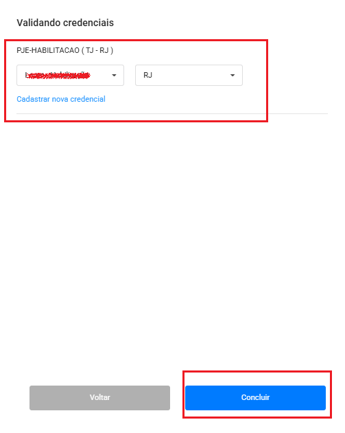 Assim que todos forem carregados, a tela para selecionar a credencial aparecerá – dessa forma, você precisa conferir se é o certificado correto (caso haja necessidade, você pode alterar) e clique em concluir: