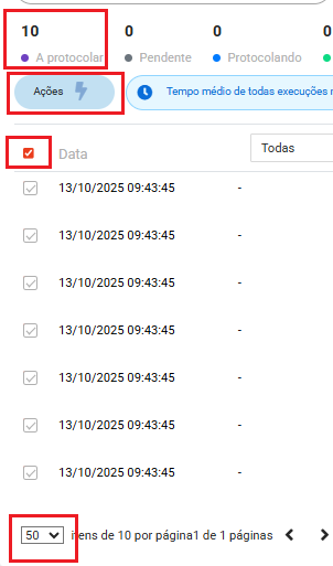 Assim que finalizar o carregamento, todos os itens aparecerão no status “a protocolar” – selecione todos e clique em “ações”: